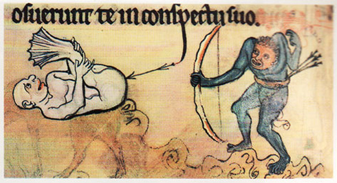 Marginal illustrations could be profane and bizarre: one manuscript of the romance of Lancelot shows a nun breastfeeding a monkey; another marginal image in the Rutland Psalter features a demon of some sort firing an arrow into the ass of a merman.