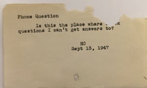 ![“[Question:] ‘Could you tell me the thickness of a US Postage Stamp with the glue on it?’ [Answer:] ‘Sorry we couldn’t tell you that quickly, why don’t you try the post office.’ [Reply:] ‘This is the post office.’”](http://i.guim.co.uk/static/w-620/h--/q-95/sys-images/Guardian/Pix/pictures/2015/5/27/1432722216065/8c1eb47b-a70a-463b-a77b-18c2dfc5de45-620x620.jpeg)
